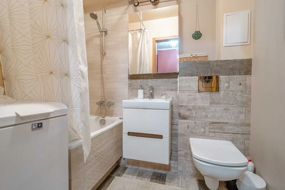 W łazience znajduje się wanna, pralka, toaleta, lustro oraz szafka z umywalką.